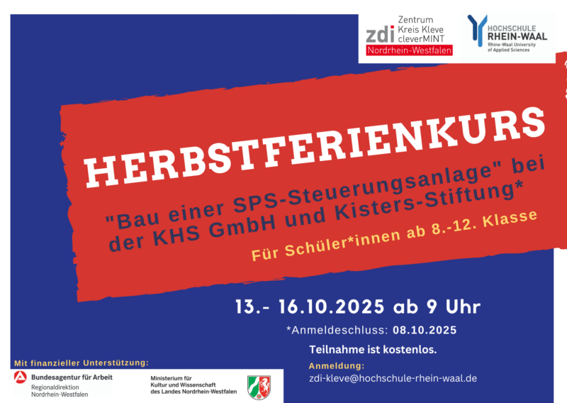 Schüler*innen aufgepasst: Wenn ihr Spaß an Technik habt, könnt ihr in den Herbstferien kostenlos „schnuppern“, wie eine SPS-Steuerungsanlage funktioniert und wie sie gebaut wird. Weitere Informationen und die Anmeldung zum Kurs gibt´s hier: https://zdi-kleve.de/herbstferienkurs-2025/